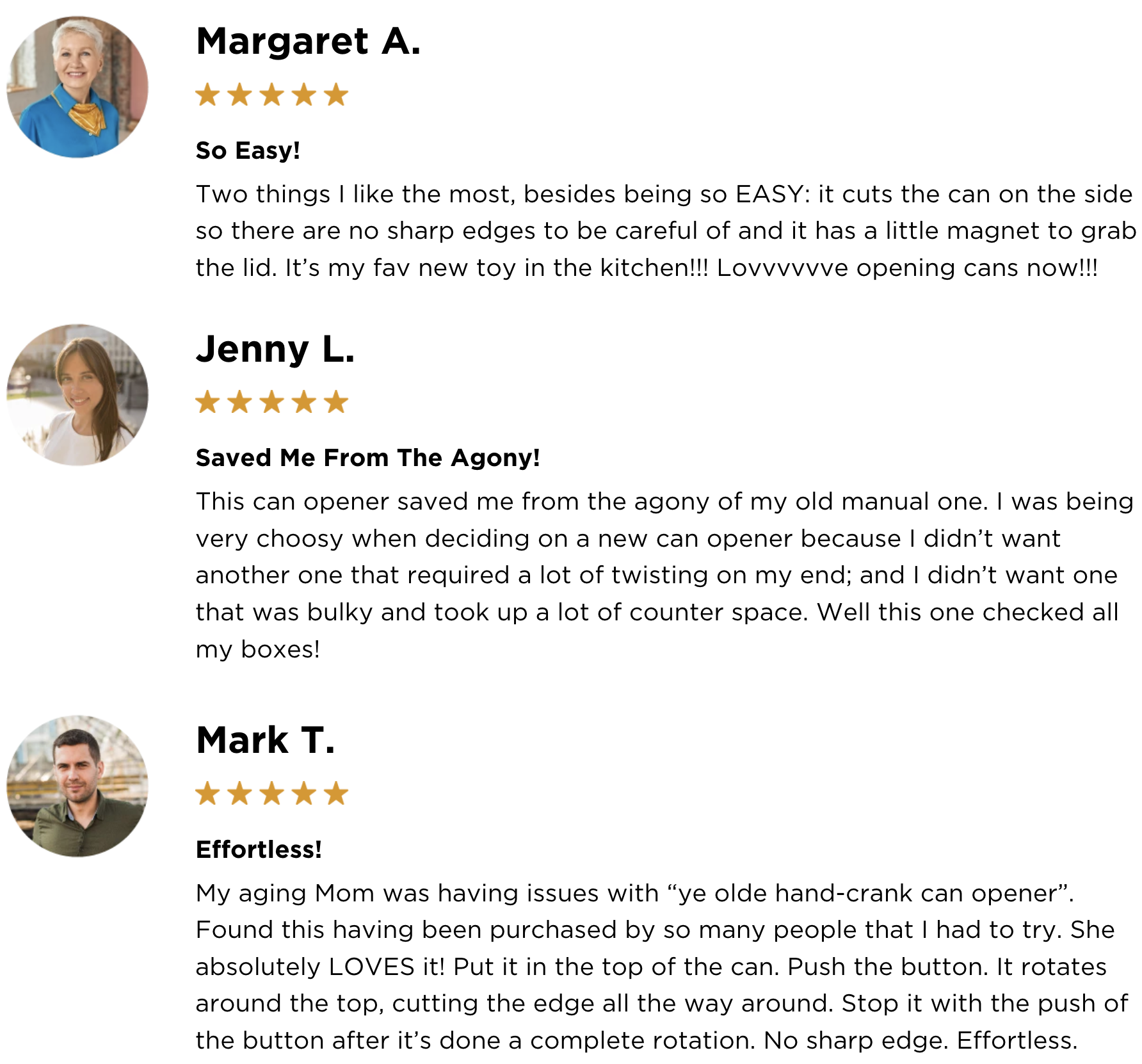 Opens cans while leaving edges that are safe and smooth,